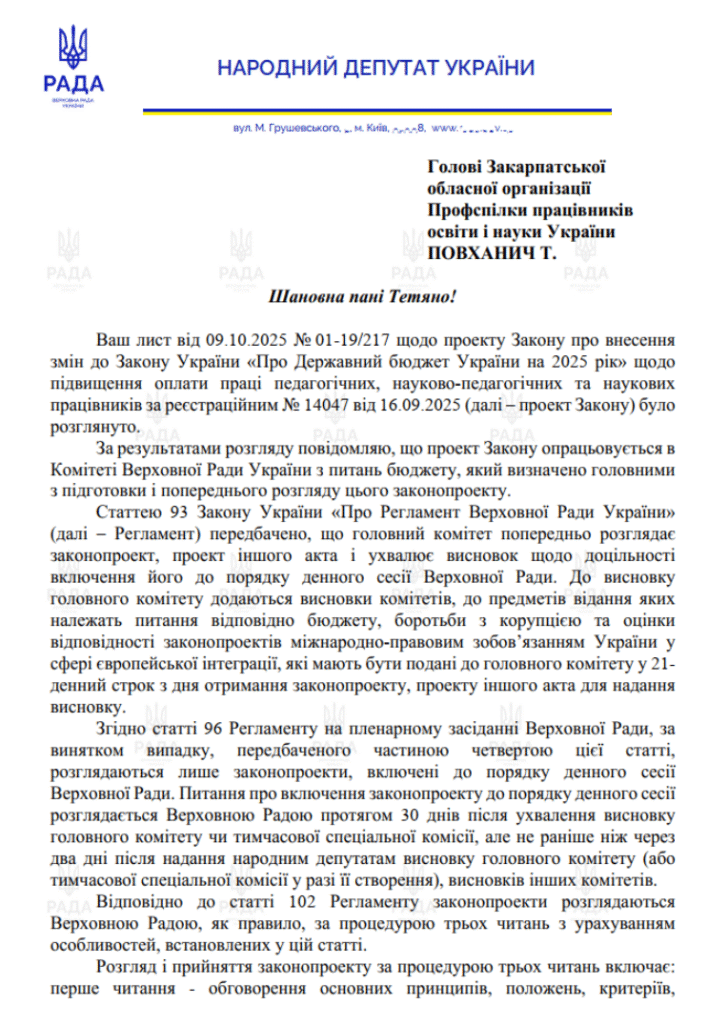 Також Закарпатська обласна організація Профспілки працівників освіти і науки України надіслала звернення до голови Комітету з питань освіти, науки та інновацій Верховної Ради України Сергія Бабака з приводу зареєстрованого проєкту закону «Про Державний бюджет України на 2026 рік» за № 14000 від 15.09.2025, підготовлений Кабінетом Міністрів України.