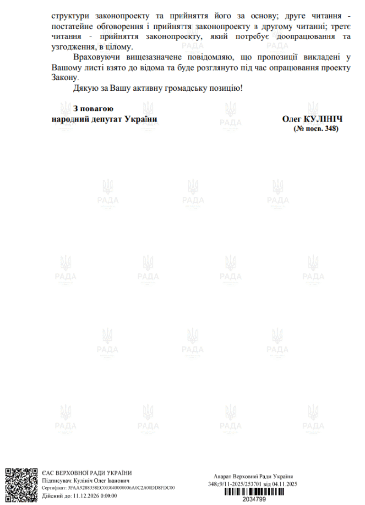 Публікуємо до вашого поінформування лист-відповідь від народного депутата України Олега Кулініча: