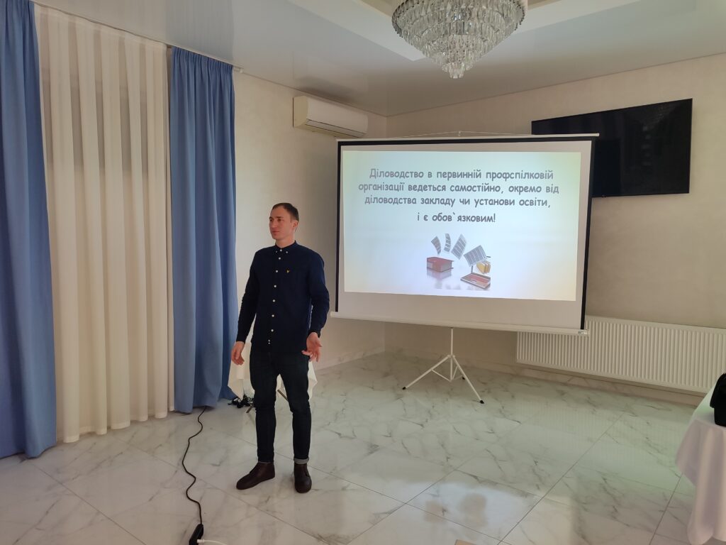 Завершальний блок, про діловодство в первинній профспілковій організації, мотивацію членства у профспілці та її інформаційну діяльність озвучив фахівець з профспілкової діяльності обласної організації Профспілки Федір Смірнов. Учасники заходу дізналися як правильно потрібно оформляти документи первинної профорганізації, на які блоки ця документація ділиться; почули про облік профспілкового членства, номенклатуру справ, планування роботи, орієнтовний перелік комісій при первинці тощо. Не менш цікавим був розділ про стратегію побудови ефективної інформаційної роботи в первинній оргланці. Говорили про те, які канали комунікації використовувати, зміст публікацій та правила контенту, який зможе зацікавити аудиторію.