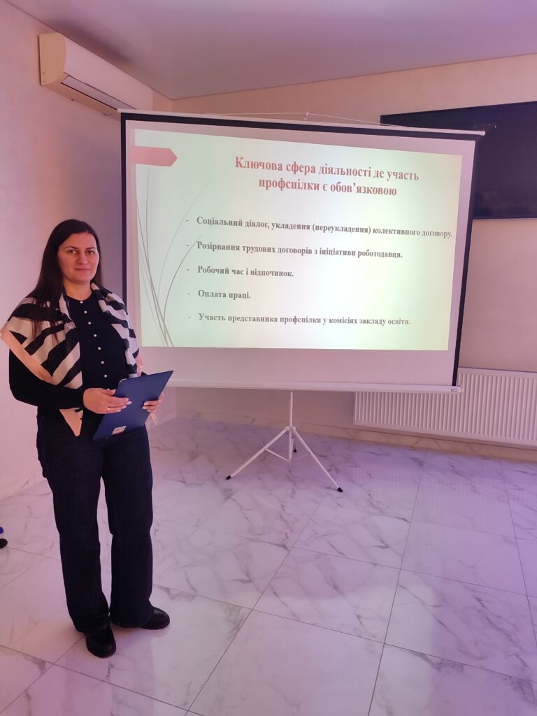 Світлана Сег, відповідальний представник з охорони праці обласної організації Профспілки озвучила важливе питання щодо організації роботи з охорони праці. Була розглянута нормативно-правова документація з охорони праці, повноваження профспілок з питань охорони праці, розділ «Охорона праці» в колективному договорі та основні дії профспілок у розслідуванні нещасних випадків.