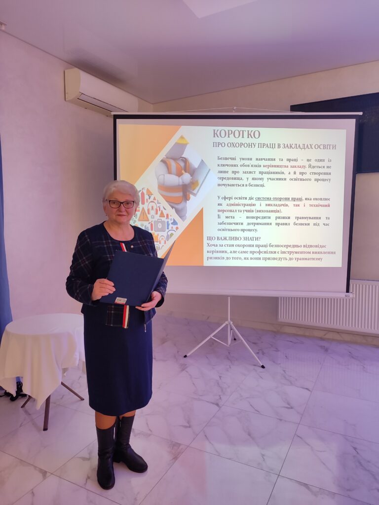 Світлана Сег, відповідальний представник з охорони праці обласної організації Профспілки озвучила важливе питання щодо організації роботи з охорони праці. Була розглянута нормативно-правова документація з охорони праці, повноваження профспілок з питань охорони праці, розділ «Охорона праці» в колективному договорі та основні дії профспілок у розслідуванні нещасних випадків.